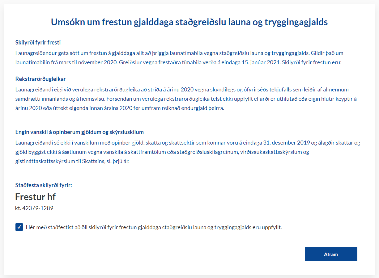 Staðfesta þarf með haki í viðeigandi reit að öll skilyrði fyrir frestun séu til staðar hjá launagreiðanda.