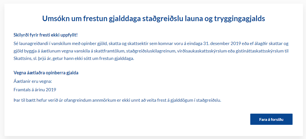 Eftir að umsækjandi hefur hakað við að öll skilyrði séu uppfyllt er kannað hvort hann hefur staðið í skilum með opinber gjöld og hvort þau byggjast á áætlun. Skuldi hann umtalsverð opinber gjöld eða hefur ekki skilað lögboðnum skilagreinum síðustu þrjú ár fær hann þessa síðu þar sem honum er bent á að bæta úr annmörkum áður en lengra er haldið.