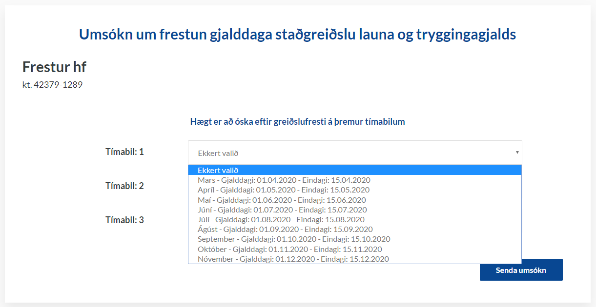 Útbúinn hefur verið rafrænn farvegur fyrir umsóknir um frestun á gjalddögum staðgreiðslu og tryggingagjalds. Hér að neðan eru leiðbeiningar um hvernig hægt er að bera sig að við að sækja um.