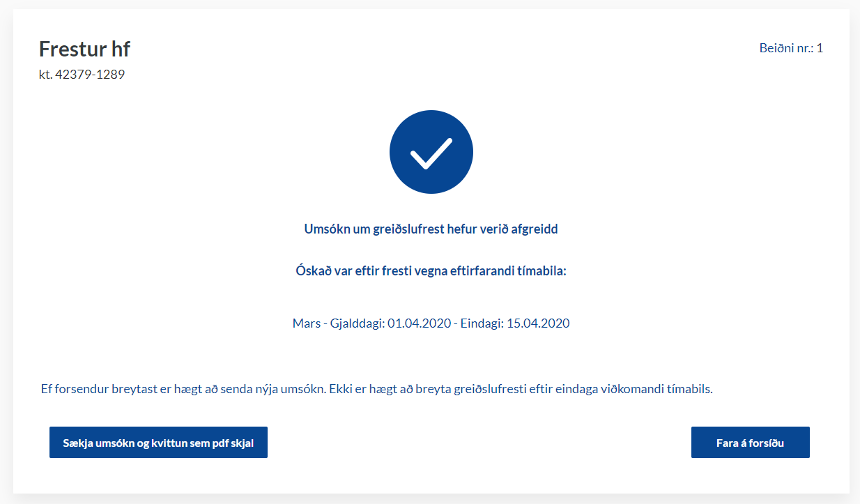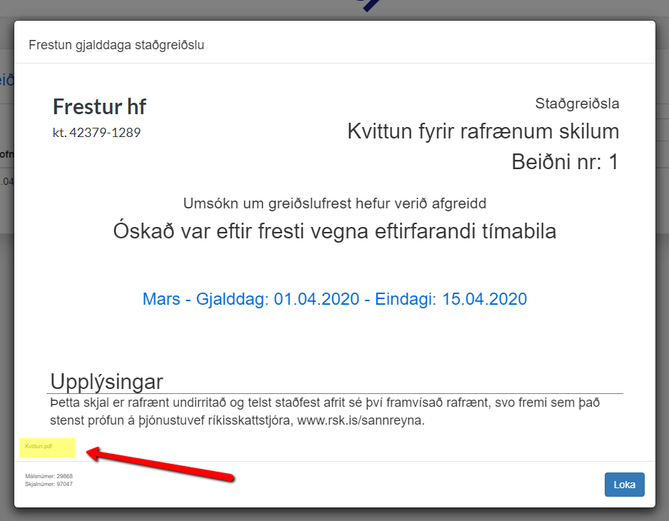 Athygli er vakin á að afgreiðsla Skattsins á greiðslufrestun felur ekki í sér staðfestingu á því að skilyrði hennar hafi verið uppfyllt á afgreiðsludegi.