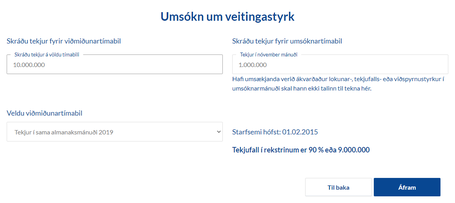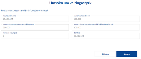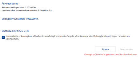 Þegar búið er að skrá öll stöðugildi og smella á "Áfram" kemur síða á skjáinn þar sem allar upplýsingar eru dregnar saman; skilyrði, forsendur og niðurstaða. Veitingastyrkur er reiknaður út miðað við uppgefnar forsendur og fjárhæðin birt umsækjanda.