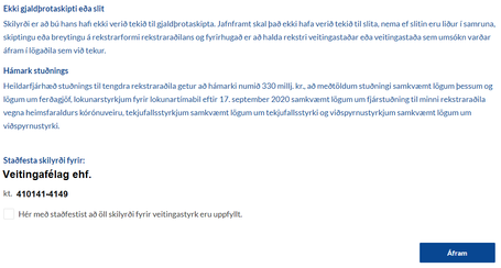 Við innskráningu er athugað hvort umsækjandi uppfylli tiltekin frumskilyrði. Ef skilyrði eru ekki uppfyllt kemst hann ekki lengra með umsóknina. Það á t.d. við um ef umsækjandi er í vanskilum með opinber gjöld sem komin voru á eindaga fyrir 1. ágúst 2021, hefur ekki skilað skattframtali, eða skilagreinum í staðgreiðslu eða virðisaukaskatti. Athugið að hægt er að greiða upp slík vanskil og skila inn gögnum og fara síðan aftur inn í umsókn og sækja um.