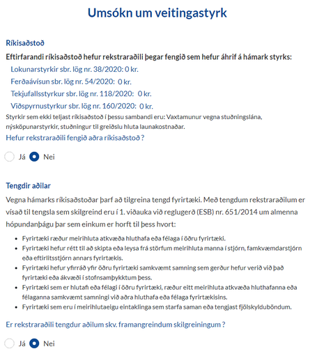 Hafi umsækjandi fengið aðra styrki sem teljast ríkisaðstoð þarf að svara spurningu þar um með því að haka við "Já". Þá koma upp innsláttarsvæði þar sem skrá skal fjárhæð og tilgreina hvaða styrk er um að ræða.