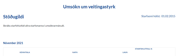 Veitingastyrkur er m.a. reiknaður út frá fjölda stöðugilda í rekstrinum. Á næstu síðu umsóknar er listi yfir launagreiðslur umsækjanda í umsóknarmánuði. Skrá þarf starfshlutfall allra starfsmanna sem störfuðu við veitingastað/veitingastaði í hverjum mánuði; 100 fyrir fullt starf, 50 fyrir 50% starf o.s.frv.