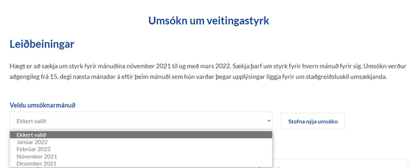 Ein umsókn er fyrir hvern almanaksmánaðanna frá og með nóvember 2021 til og með mars 2022. Einungis er unnt að sækja um fyrir einn mánuð í einu. Dæmi: Rekstraraðili sækir um veitingastyrk fyrir nóvember 2021. Hann getur ekki sótt um fyrir desember 2021, eða eftir atvikum aðra mánuði á umræddu tímabili, fyrr en hann hefur undirritað fyrri umsókn rafrænt.