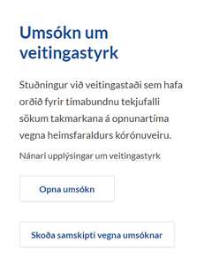 Með lögum nr. 8/2022 var samþykkt á Alþingi að greiða styrki til þeirra rekstraraðilar sem hafa orðið fyrir verulegu tekjufalli sökum takmarkana á opnunartíma veitingastaða vegna heimsfaraldurs kórónuveiru.