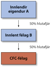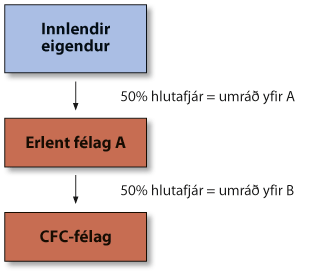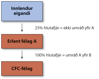 Dæmi 3. Innlendir eigendur eiga 25% í CFC- félaginu vegna óbeinnar eignarhlutdeildar og hafa umráð yfir því félagi vegna stöðu sinnar í félagi A