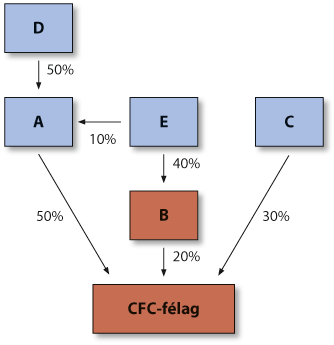 Dæmi 3. Félagið A er skattlagt í samræmi við 50% eignarhlutdeild sína í CFC-félaginu. D og E eru ekki skattlagðir vegna eignarhlutdeildar í CFC í gegnum A þar sem sú eignarhlutdeild hefur verið að fullu skattlögð hjá A. E er skattlagður vegna eignarhlutdeildar sinnar í CFC-félaginu í gegnum erlenda félagið B. Eignarhlutdeild nemur 8% (0,4 x 0,2 = 0,08). C er skattlagður í samræmi við 30% eignarhlutdeild í CFC-félaginu vegna beinnar eignarhlutdeildar. Sameiginlegt eignarhald innlendra aðila nær hér 88%.