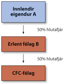 Dæmi 1. Eignarhlutdeild A í CFC-félaginu er 25% með óbeinu eignarhaldi (0,5 x 0,5 = 0,25). Eignarhlutdeild B í CFC-félaginu er 50%. Sameiginlegt eignarhald innlendra aðila yfir CFC-félaginu er 50%, þ.e. það getur ekki verið meira en heildareignarhlutdeild félagsins B. Samkvæmt reglunni takmarkast skattlagning við þá sameiginlegu eignarhlutdeild. Félag B er skattlagt í samræmi við eignarhlutdeild þess sem leiðir til þess að innlendi eigandi þess félags (eigandi A) er ekki skattlagður vegna eignaraðildar sinnar í CFC-félaginu, þ.e. sameiginleg eignarhlutdeild er að fullu skattlögð hjá félagi B.