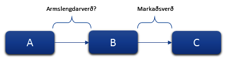 A og B eru tengdir aðilar. C er ekki tengdur A eða B. Gefum okkur að A selji B vöru á 30 og B selur vöruna til C á 100. Spurningin er þá hvort verð í viðskiptum A og B sé í samræmi við armslengdarreglu.