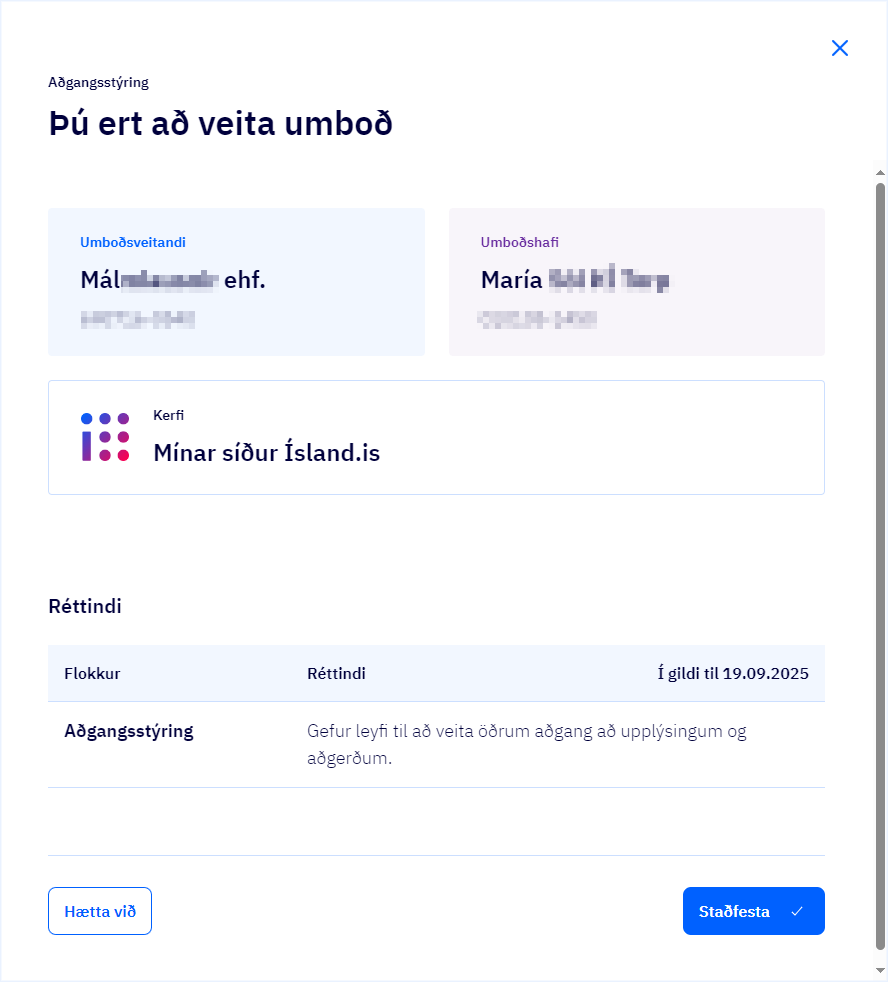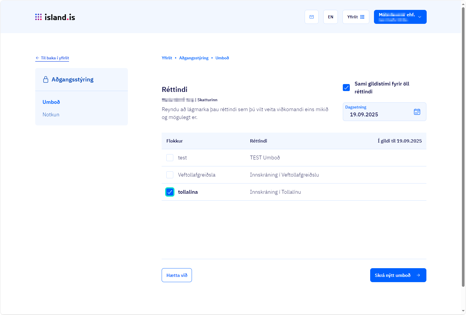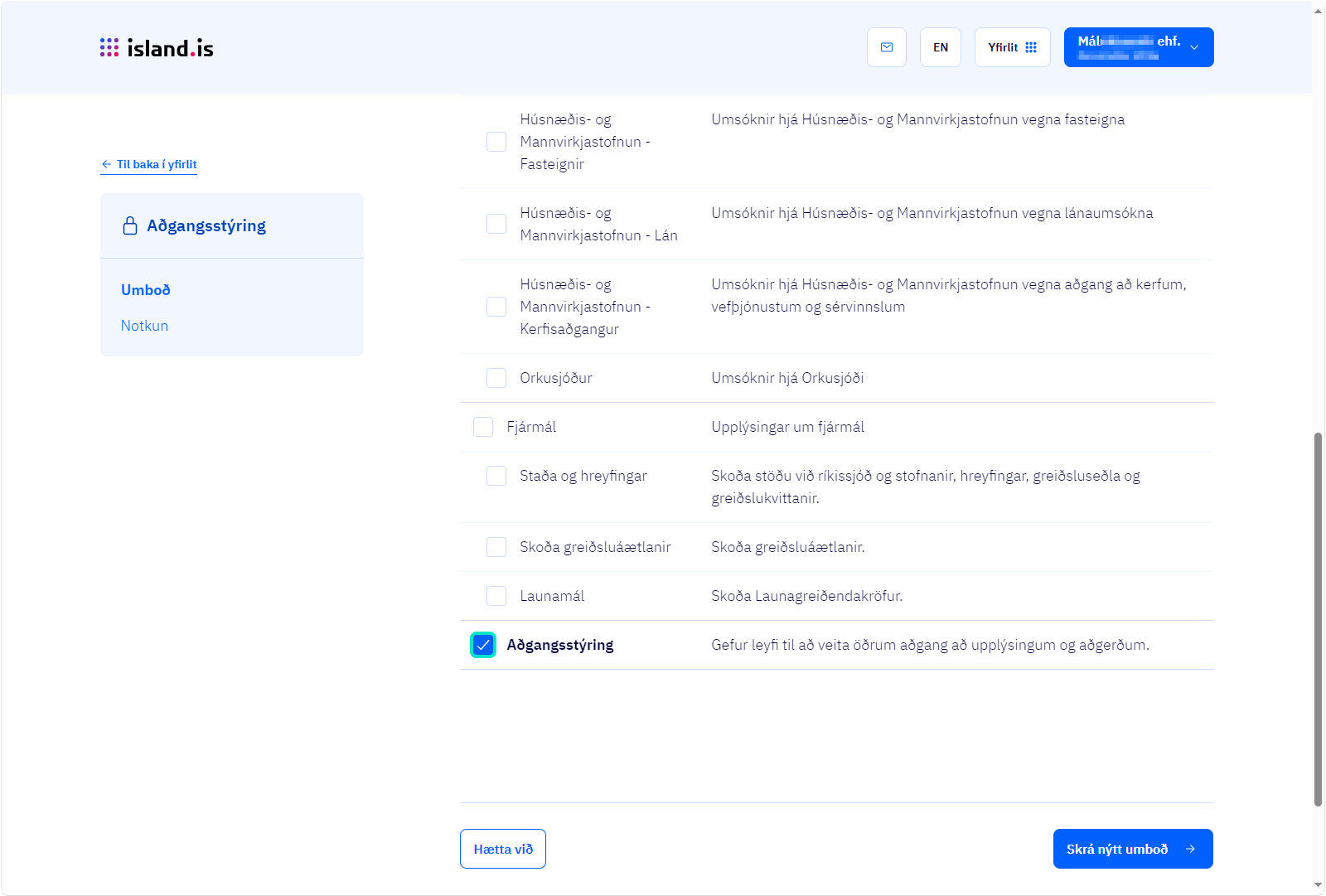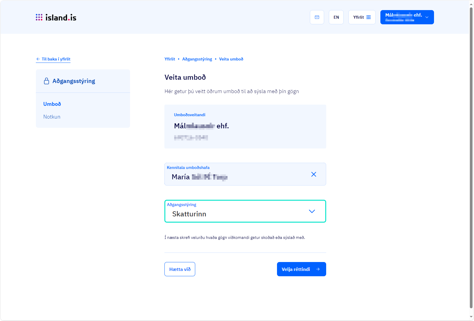 - Smellir á Skrá nýtt umboð, Skráir kennitölu þess sem á að hafa réttindi, velur Mínar síður Ísland.is undir Aðgangsstýring