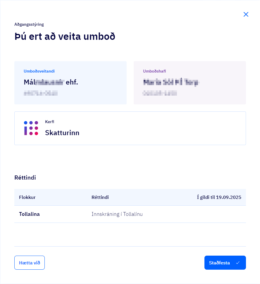 Prókúruhafar fyrirtækja og stofnanna eða starfsmenn sem fengið hafa umboð til aðgangsstýringar geta gefið öðrum aðgang fyrir hönd fyrirtækja eða opinberra aðila. Með þessum aðgangi geta starfsmenn séð ákveðnar upplýsingar fyrirtækis á Mínum síðum á island.is eða fengið aðgang að kerfum eins og Tollalínu eða Veftollafgreiðslu.