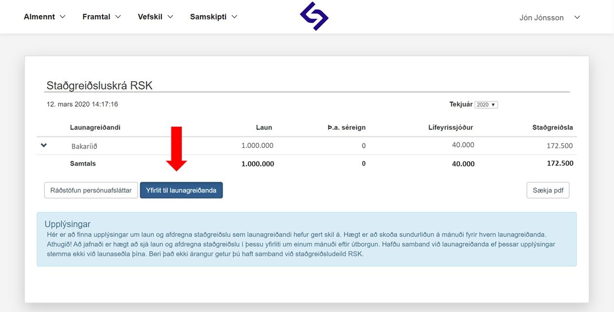 3. Undir töflunni með ítarlegum upplýsingum um laun, greiddan skatt, skattþrep og nýtingu persónuafsláttar er hnappur „Sækja yfirlit til launagreiðanda“. Með honum má hlaða niður Pdf skjali sem afhenda má launagreiðanda.