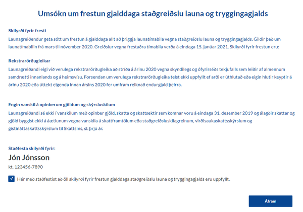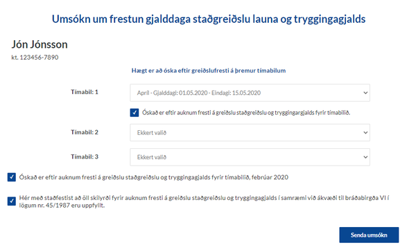 The employer must have applied for postponement of returns on the service pages of Iceland Revenue no later than on the final due date of the payment period in question (application submitted). The application shall be accompanied by a declaration from the employer to the effect that the conditions of the postponement are met. Postponement applications can be submitted on the service website of Iceland Revenue. The payer uses the application form to select the dates on which he wishes to postpone due date payments and declares, by selecting the appropriate field, that he believes that he fulfils the conditions of the provision for postponement. The tax authorities may specifically request that the applicant show, by means of reasoning and data, that there are significant operating difficulties, such as with reference to the decrease in VAT-liable turnover, and that the conditions of the provision for postponement are in other respects met.