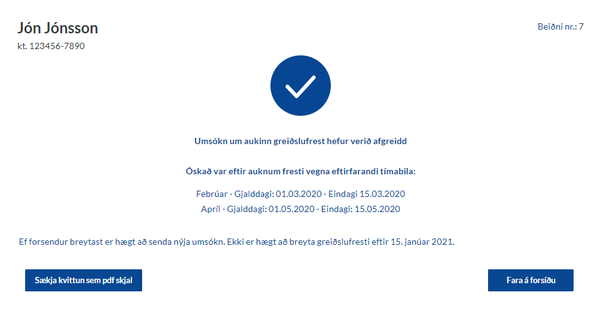 Once the application has been submitted a confirmation appears. By pressing the button "Sækja kvittun sem PDF skjal" one can download the confirmation as a PDF-document. The confirmation will also be saved on the communications page of the website.