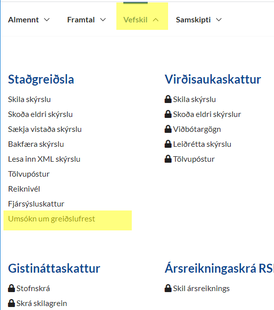 The application can also be found in the menu under Vefskil > Staðgreiðsla > Umsókn um greiðslufrest (Web returns > Withholding tax > Application for payment postponement).