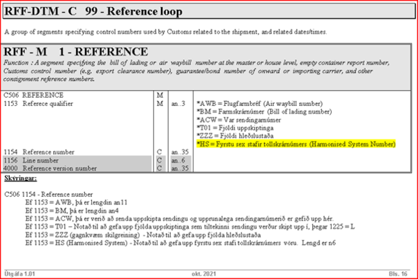 Þar má einnig nálgast skrá HS-númera (Harmonised System), þ.e. fyrstu sex stafi íslensku tollskrárinnar, dæmi um EDI-skeyti farmskrár (CUSCAR) o.fl.
