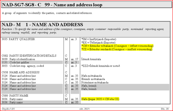 Dæmi: NAD-gagnaliður er þannig skráður í innfluttum sendingum: NAD+SU++Erlendur sendandi:Útlendgata:Borg+++++Póstnúmer+GB'