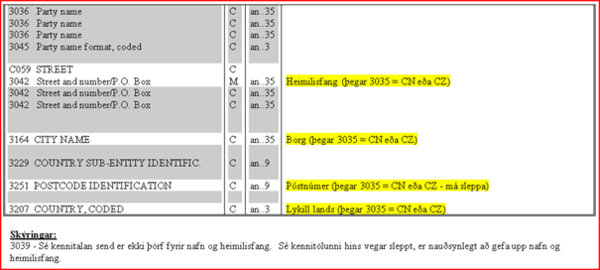 Nota má C058 og gagnastak 3124 fyrir nafn, heimili og borg/staður ef möppunarskrá CUSCAR EDI-skeytis hefur ekki verið uppfærð til samræmis við kröfur tollyfirvalda um breytingar og skal þá nota kóðana SU fyrir sendanda í útlöndum og CT fyrir viðtakanda í útlöndum