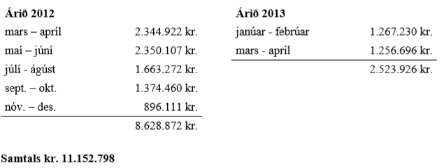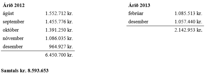 2. Eigi staðið skil á skilagreinum einkahlutafélagsins uppgjörstímabilin ágúst, október, nóvember og desember rekstrarárið 2012 á lögmæltum tíma og hafa eigi staðið ríkissjóði skil á staðgreiðslu opinberra gjalda, í samræmi við fyrirmæli III. kafla laga nr. 45/1987, um staðgreiðslu opinberra gjalda, sem haldið var eftir af launum starfsmanna félagsins greiðslutímabilin ágúst til og með desember rekstrarárið 2012 og febrúar og desember rekstrarárið 2013, samtals að fjárhæð kr. 4.399.738 hvað varðar ákærða Valgarð og samtals að fjárhæð kr. 8.593.653 hvað varðar ákærða X, sem sundurliðast sem hér greinir.