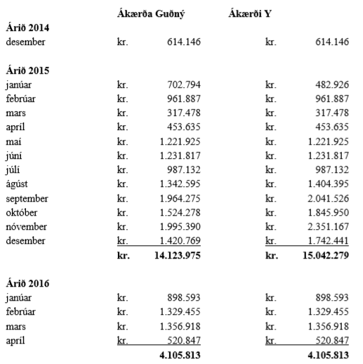 2. Ekki staðið skil á skilagreinum einkahlutafélagsins vegna staðgreiðslu opinberra gjalda á lögmæltum tíma vegna greiðslutímabilanna desember rekstrarárið 2014, febrúar og september til og með desember rekstrarárið 2015 og febrúar og mars rekstrarárið 2016 og hafa ekki staðið ríkissjóði skil á staðgreiðslu opinberra gjalda, í samræmi við fyrirmæli III. kafla laga nr. 45/1987, um staðgreiðslu opinberra gjalda, sem haldið var eftir af launum starfsmanna einkahlutafélagsins vegna greiðslutímabilanna desember rekstrarárið 2014, janúar til og með desember rekstrarárið 2015 og janúar til og með apríl rekstrarárið 2016, samtals að fjárhæð 18.843.934 krónur hvað varðar ákærðu Guðnýju og 19.762.238 krónur hvað varðar ákærða Y, en þær fjárhæðir vangoldinnar staðgreiðslu sundurliðast svo: