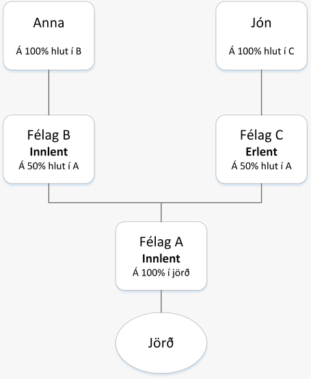 hvort um sig 50% beinan hlut í félagi B (beinir eigendur), sem þýðir að þau