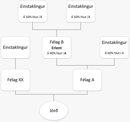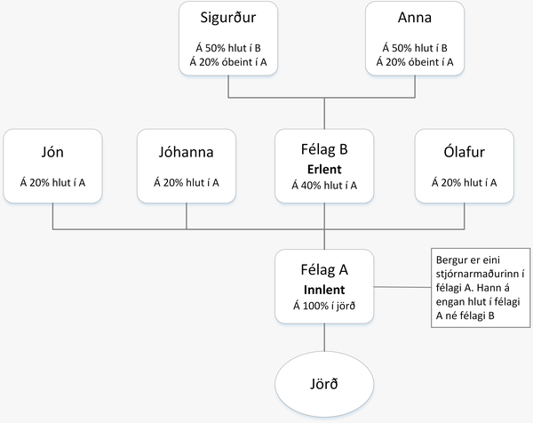 Félag A á jörð og er í 50% beinni eigu erlenda félagsins C. Félag A er