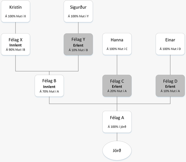 Meðfylgjandi er dæmi um hvernig reikna má beint og óbeint erlent eignarhald félags.