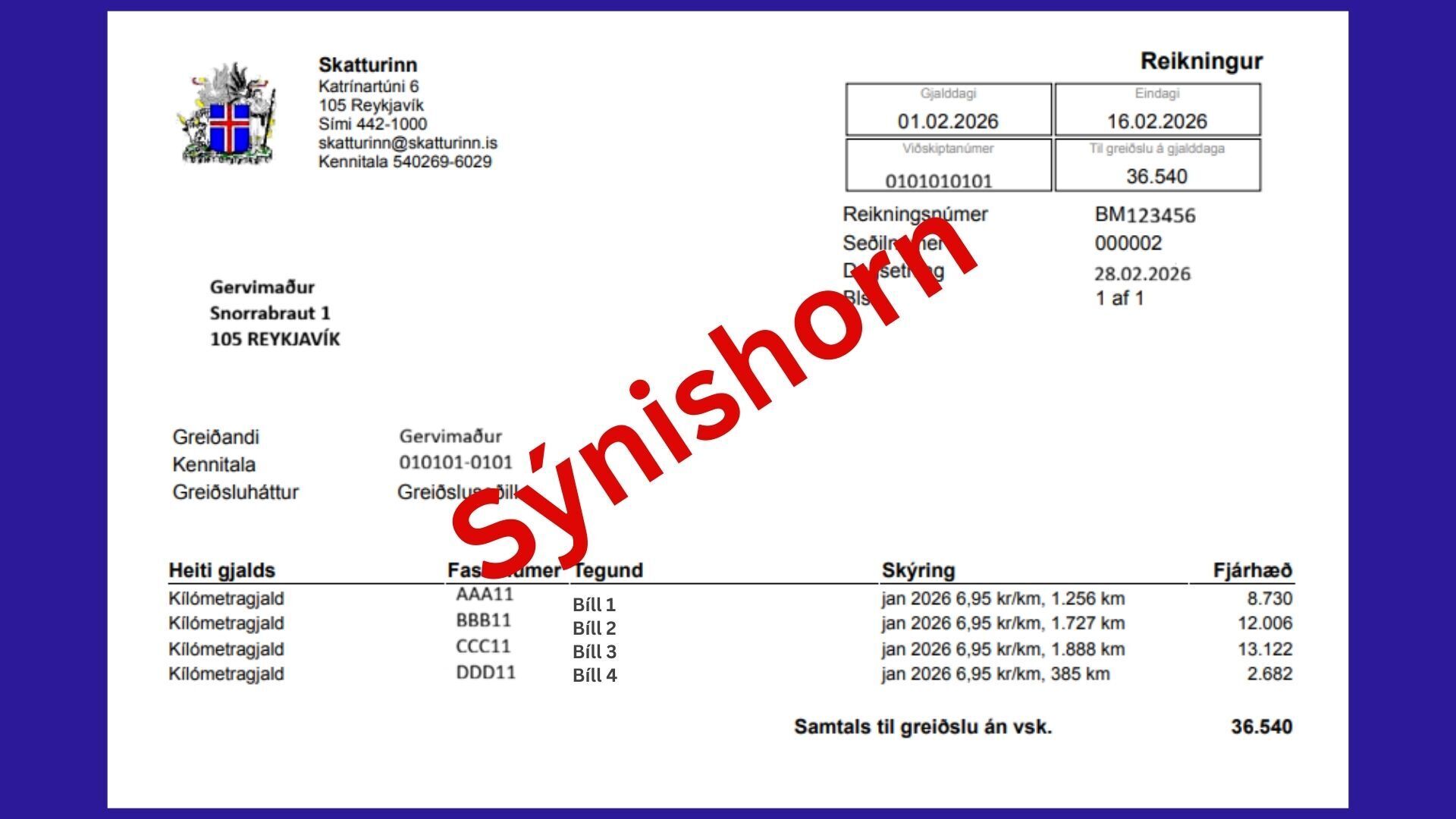 Greiðsluseðill vegna kílómetragjalds ökutækja mun berast eigendum og umráðamönnum í heimabanka föstudaginn 30. janúar. Reikningurinn verður jafnframt aðgengilegur í pósthólfi þeirra á Mínum síðum á Ísland.is sunnudaginn 1. febrúar.